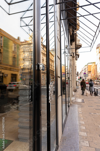 © ArtmediaworX, Fototapeta premium Closed Store due to Coronavirus pandemic. Locked Store Door with Padlock. Selective focus on the padlock