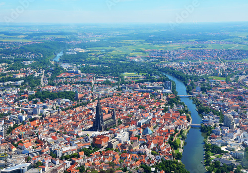 © Mirjam Claus, Fototapeta premium Closer Aerial view of Ulm Minster (Ulmer Münster) and Ulm, south germany on a sunny summer day