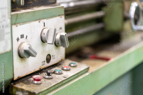 © Atiwat, Fototapeta premium Closeup and crop old model lathe and drilling machine