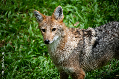 © Jack Tamrong, Fototapeta premium Closeup beautiful lonly wild Coyote looking at camera on green nature grass background.