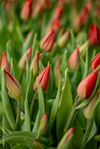© kostikovanata, Fototapeta premium Closeup beautiful red tulips buds green leaves and stems with blurred copyspace