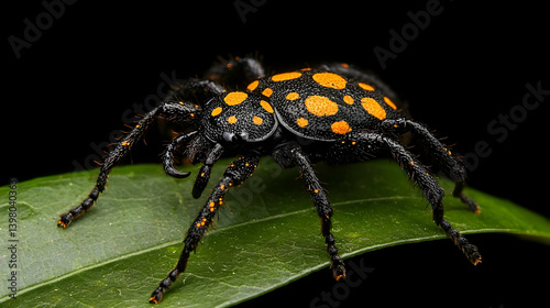 © artzone, Naklejka premium Closeup Black And Orange Spotted Beetle On Green Leaf