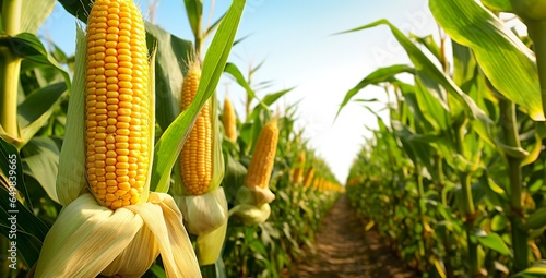 © MstHafija, Obraz premium Closeup corn cobs in corn plantation field.