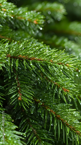 © share, Fototapeta premium Closeup Dewy Evergreen Branch Photo
