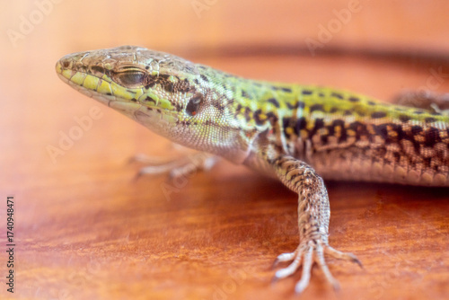 Naklejka premium Closeup di lucertola campestre in casa con occhi chiusi
