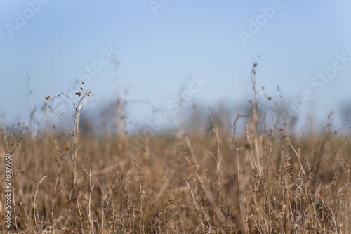 Obraz premium Closeup dry field grass on blurred background. Minimal depth of field. Early...