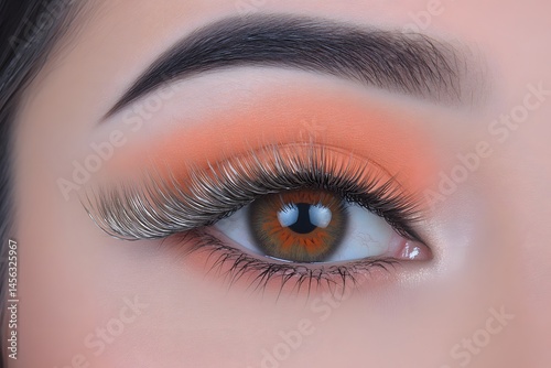 © Mokles, Obraz premium Closeup Eye Makeup with Peach Eyeshadow and Dramatic Lashes