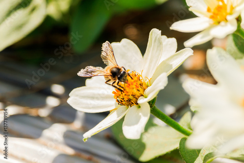 © sanpom, Fototapeta premium Closeup flower bee swarm in the gar den