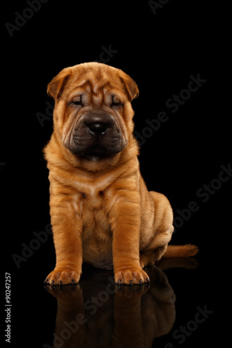 © seregraff, Obraz premium Closeup Funny Sharpei Puppy Sits on Black Mirror