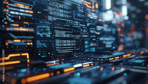 © AhmadTriwahyuutomo, Obraz premium Closeup Futuristic Software Interface: Holographic Code and Digital Elements