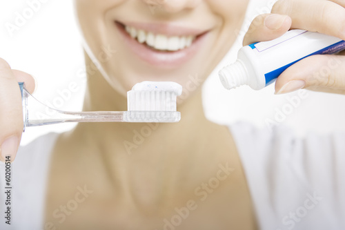 © kalcutta, Fototapeta premium Closeup girl with toothbrush cleaning teeth at home, whiten toot