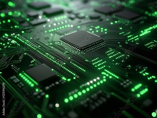 Fototapeta premium Closeup Green Circuit Board Glowing Microchip Technology. AI Generated