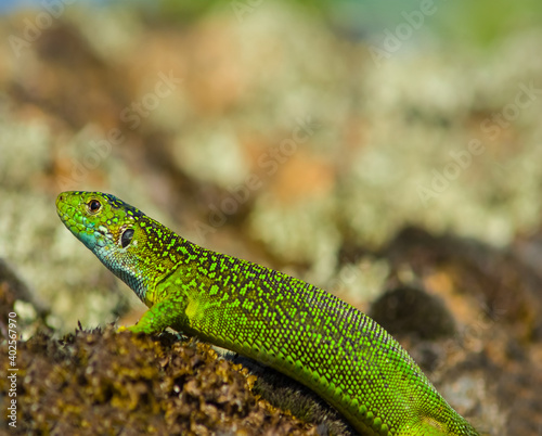 Fototapeta premium closeup green lizard sit on a stone, wild animal background