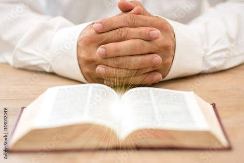 © Boonchai, Obraz premium Closeup hand open book for reading concept background