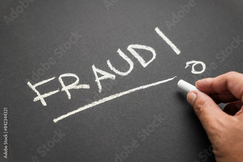 Fototapeta premium Closeup hand write a FRAUD topic with chalk on the chalkboard