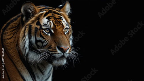 © Dealovaliandra, Naklejka premium Closeup head of tiger on black background.