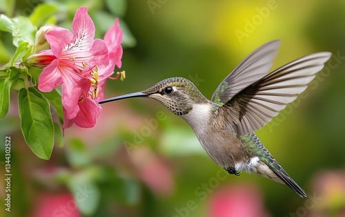 © SUKHUM, Obraz premium Closeup hummingbird hovering near pink flower midflight its blooming