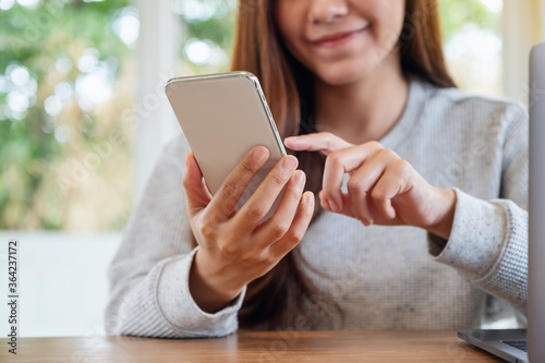 Fototapeta premium Closeup image of a beautiful asian woman holding and using mobile phone