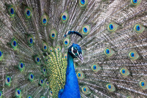 Fototapeta premium Closeup Image of a peacock dancing with its open feathers