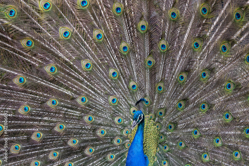 Fototapeta premium Closeup Image of a peacock dancing with its open feathers
