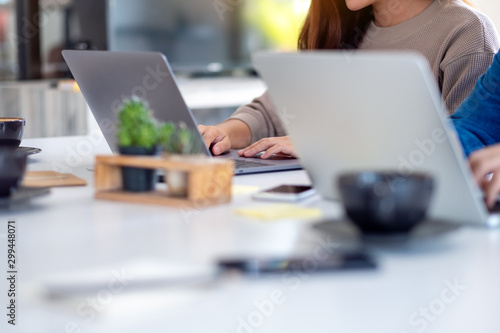 Fototapeta premium Closeup image of businessman using and working on laptop computer together in...