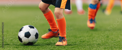 Fototapeta premium Closeup image of young football player kicking ball. School kids play sports outdoor