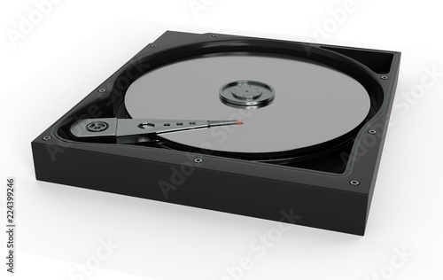 Fototapeta premium Closeup inside a hard disk drive HDD, magnetic surface and data reading mechanism 3d illustration