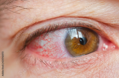 Fototapeta premium Closeup irritated infected red bloodshot eyes, conjunctivitis