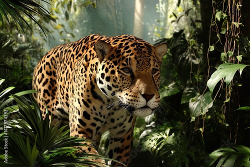 Naklejka premium Closeup Jaguar Walking in Jungle, Exotic Feline with Golden Fur and Black Spots