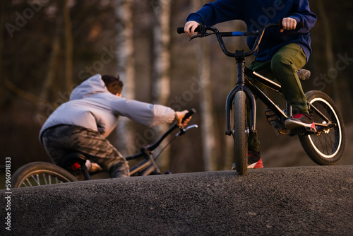 Fototapeta premium Closeup Kid boy with bicycle on a pump track park in sunset light. Asphalted...