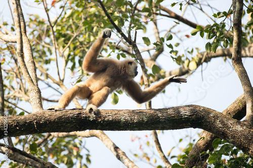 © Thipwan, Fototapeta premium Closeup Lar gibbon or White-handed gibbon, high angle view, front shot, in the morning swinging on the branch in tropical forest, Khao Yai National Park, the jungle of Thailand.