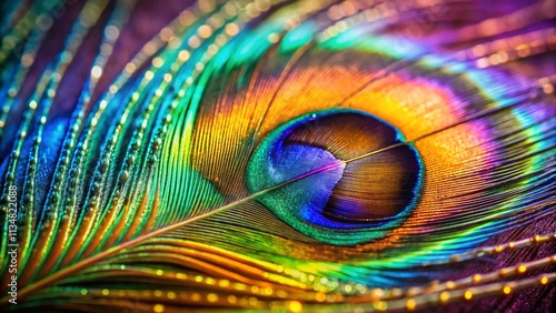 © Sirinporn, Naklejka premium Closeup Long Exposure of Vibrant Peacock Feather's Iridescent Colors and Intricate Patterns, Capturing the Beauty of Nature in Fine Detail