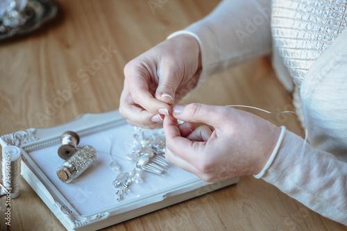 Fototapeta premium Closeup macro photo of details, workplace of decorator and creator of wedding imitation jewelry. Woman's hands in a process of creation