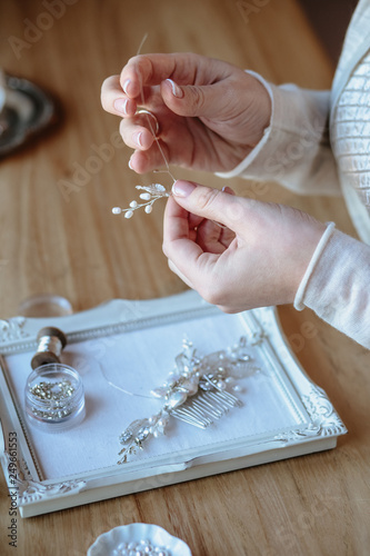 Fototapeta premium Closeup macro photo of details, workplace of decorator and creator of wedding imitation jewelry. Woman's hands in a process of creation
