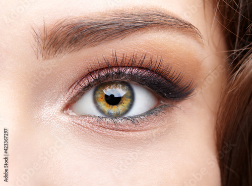 Obraz premium Closeup macro shot of human female eye with pink eyes shadows