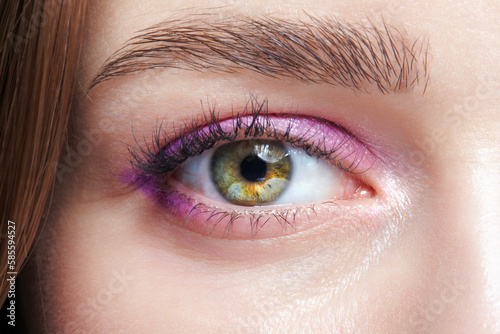 Obraz premium Closeup macro shot of human female eye with pink eyes shadows