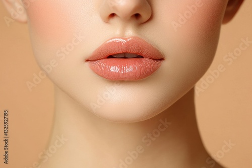 © Snap Realm, Fototapeta premium Closeup Nude Lips Makeup Peach Glossy Beauty Skin face girl woman model color shiny smooth texture
