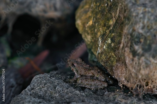 © Wirestock, Naklejka premium Closeup of a a frog perched atop a rocky outcropping covered in lush, green moss