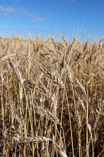 © Amelia, Fototapeta premium Closeup of a barley field with a blue sky