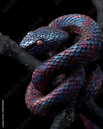© Muhammad, Obraz premium Closeup of a beautiful iridescent viper coiled on a branch