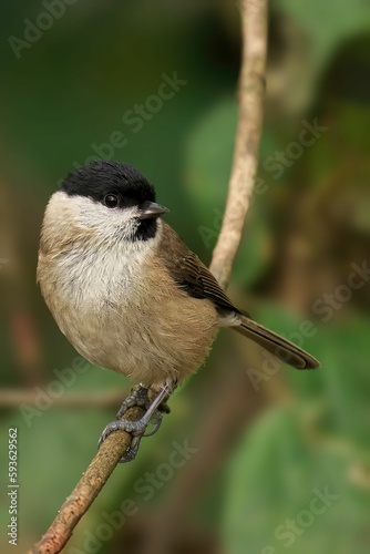 © Paul Cross/Wirestock Creators, Naklejka premium Closeup of a beautiful Marsh Tit on a branch in a forest during sunrise