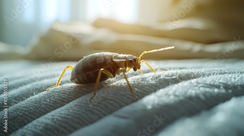 Obraz premium Closeup of a Bedbug Crawling on a Mattress Illuminated by a Flashlight...