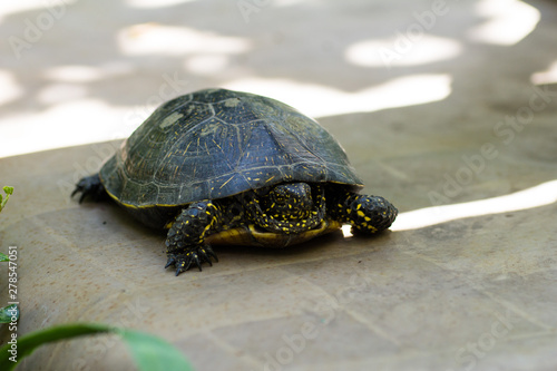 © Tetiana, Obraz premium Closeup of a black and yellow spotted turtle