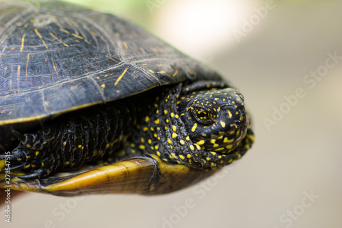 Fototapeta premium Closeup of a black and yellow spotted turtle