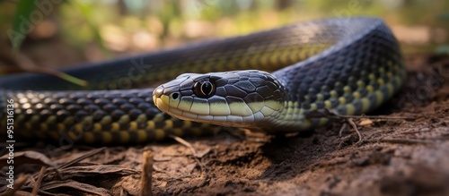 © naila mutmainah, Fototapeta premium Closeup of a Black-Banded Snake on the Forest Floor