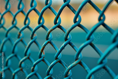 Fototapeta premium Closeup of a blue chain link fence with a blurred background, school sports...