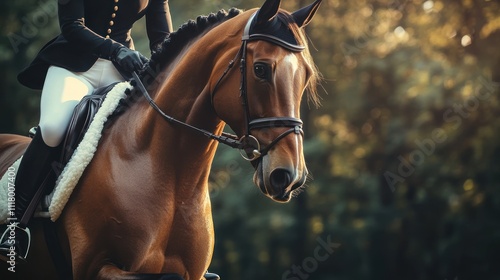 © ganteng, Fototapeta premium Closeup of a Chestnut Horse with Rider in the Forest