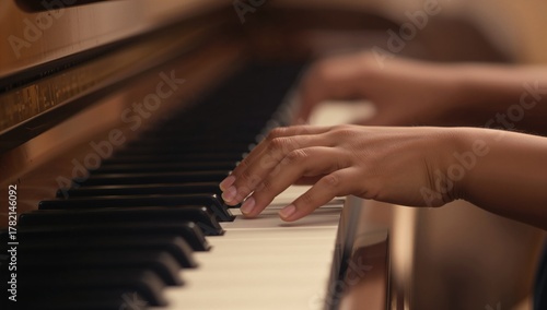 Fototapeta premium Closeup of a child's hands on piano keys, focus on musical exploration