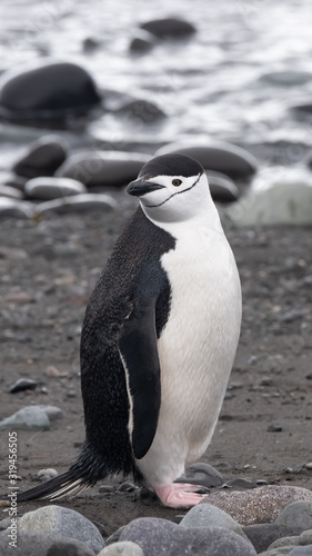 Naklejka premium Closeup of a Chinstrap penguin on a beach in the South Shetland Islands, Antarctica