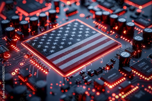 © sandi, Obraz premium Closeup of a circuit board with an American flag displayed on a microchip.